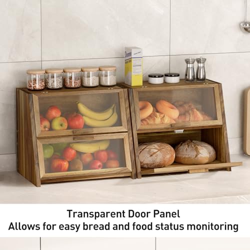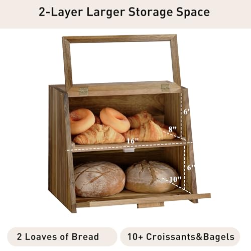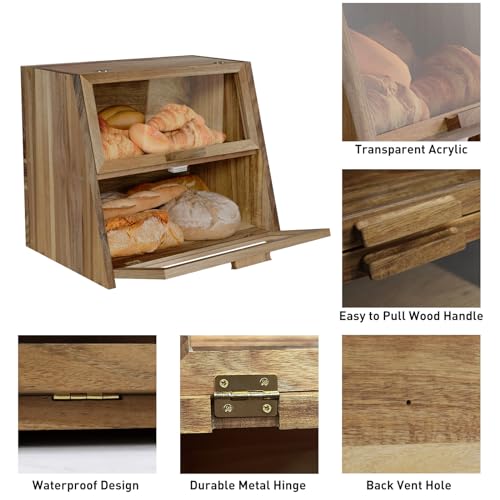 Homsailei - Acacia Wood Bread Box for Kitchen Countertop, Double Layer Natural Wooden Bread Storage Container, with Clear Windows, Back Air Vent, Large Bread Boxes for Keeping Food Fresh in Home and Kitchen