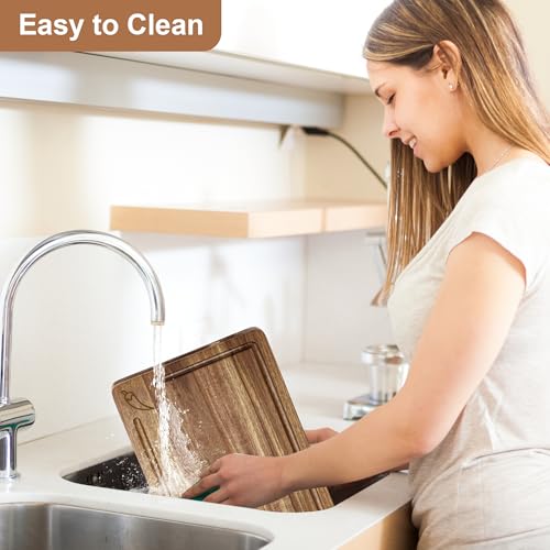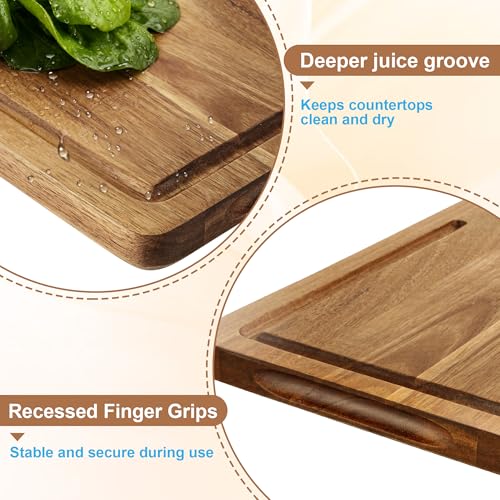 - Functional Design with Juice Groove & Built : In Handle - Each wood cutting board is equipped with a deep juice groove to trap liquids and keep countertops clean. The built-in handle offers a secure grip for easy handling and convenient storage