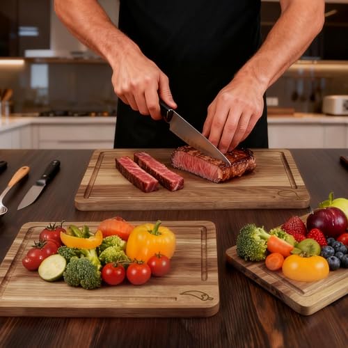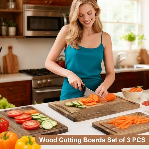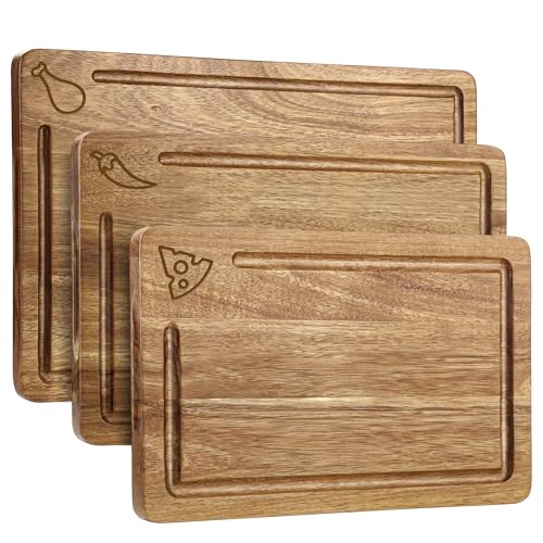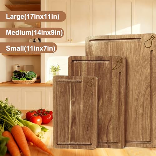 - 3-Piece Acacia Wood Cutting Board Set : This Acacia Wooden Cutting Boards Set includes Large(17"x11"), Medium(14"x9"), Small(11"x7") boards designed for diverse kitchen tasks like chopping vegetables
