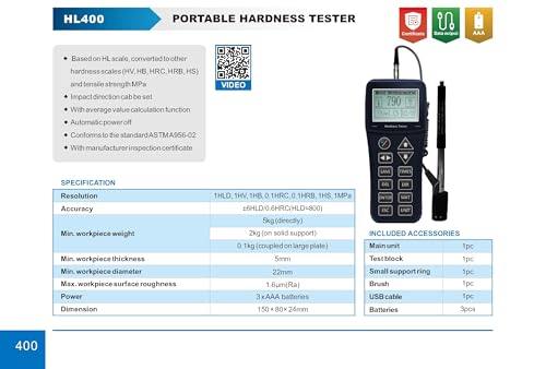 - نطاق القياس: يقيس الصلابة بمقياس HL ويتحول تلقائياً إلى مقاييس أخرى (HV, HB, HRC, HRB, HS) وقوة الشد بوحدة MPa