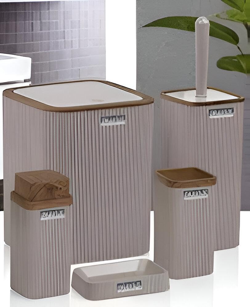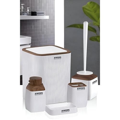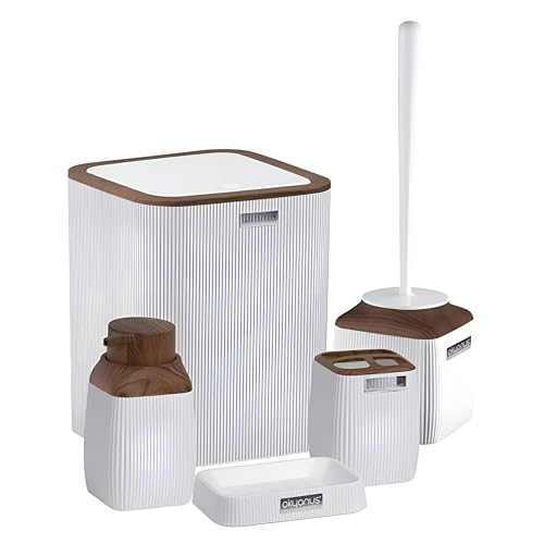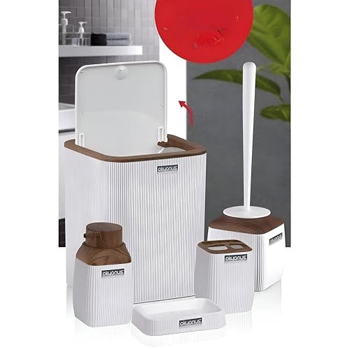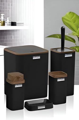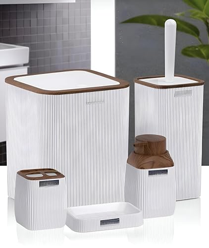 - This 5-piece bathroom accessories set includes a soap dish, soap dispenser, trash bin, toilet brush and holder, and a toothbrush holder, offering a comprehensive solution for organizing your bathroom essentials in one stylish package.