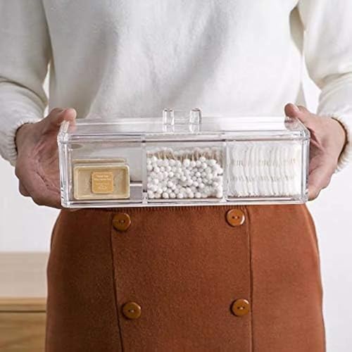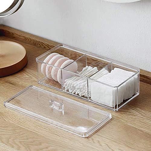 - حامل ومنظم كرات ومسحات قطن اكريليك شفاف بغطاء مع 3 أقسام ودرج تخزين للمسحات القطنية وأعواد تنظيف الأذن والفوط الصحية والمكياج ومستحضرات التجميل