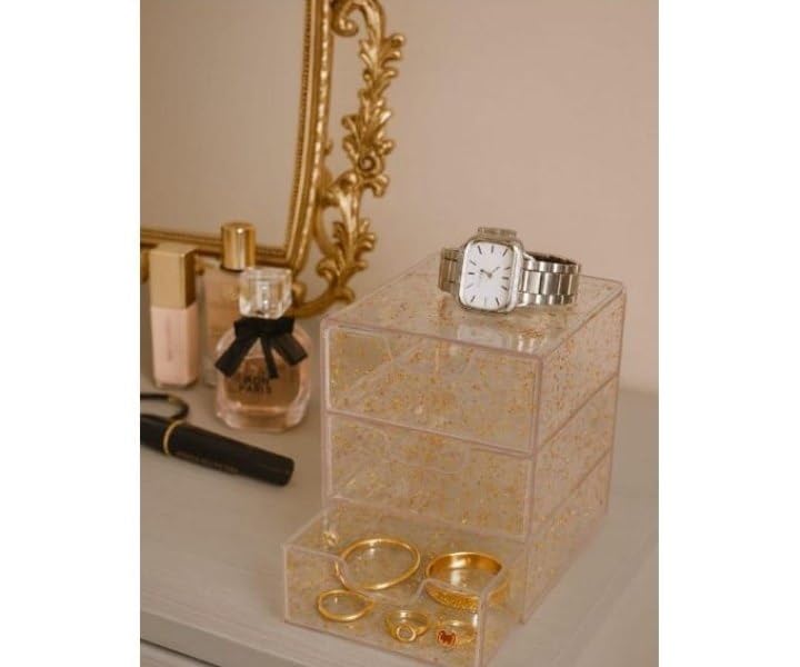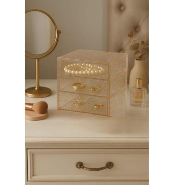 - تصميم بثلاثة أدراج: يتميز منظم المجوهرات الأكريليك بثلاثة أدراج واسعة قابلة للسحب لتخزين وتنظيم الخواتم والأقراط والقلائد والأساور وغيرها من الملحقات بدقة