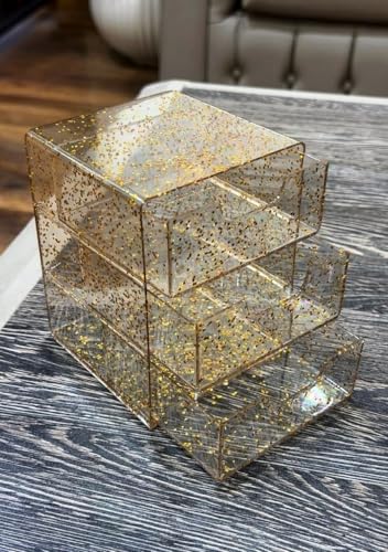 - لمسة نهائية لامعة ذهبية أنيقة: هيكل أكريليك شفاف مع لمسات لامعة ذهبية يضيف لمسة براقة إلى طاولة الزينة أو خزانة الملابس أو منضدة الحمام مع الحفاظ على المجوهرات مرئية