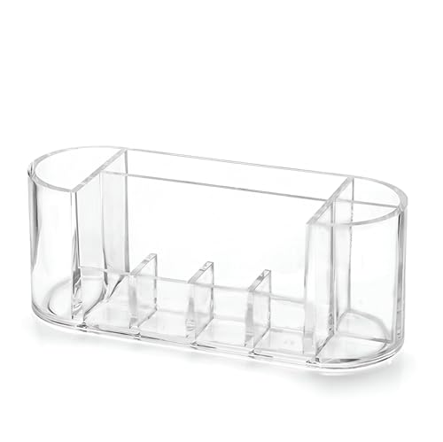 - Perfect for keeping everything in one place, this acrylic organizer has an upper section divided into eight versatile compartments. These sections are ideal for storing makeup brushes, creams, lipsticks, and other beauty tools, helping save time and effort when organizing your beauty products.