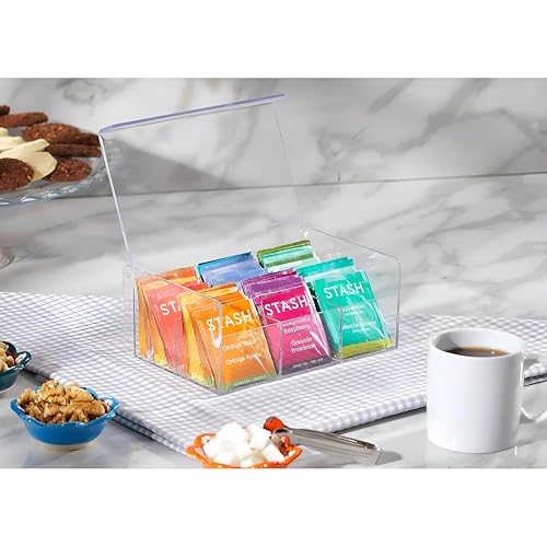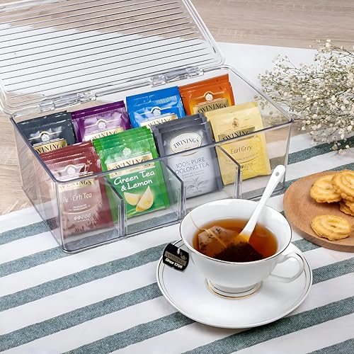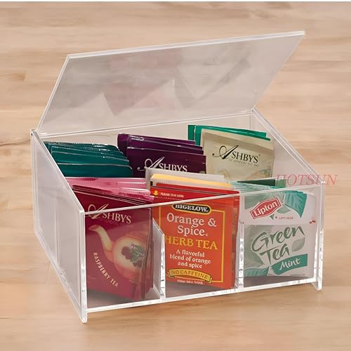 - مصنوع من الأكريليك الشفاف الفاخر، يتميز هذا المنظم بـ 6 مساحات تخزين واسعة يبلغ مقاسها تقريبًا 21.5 × 14.6 × 9.5 سم، مما يسمح لك بعرض أكياس الشاي الخاصة بك والوصول إليها بدقة مع الحفاظ على لمسة أنيقة وعصرية تعزز بسلاسة أي طاولة مطبخ أو رف مخزن أو مكتب مكتب.