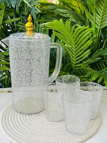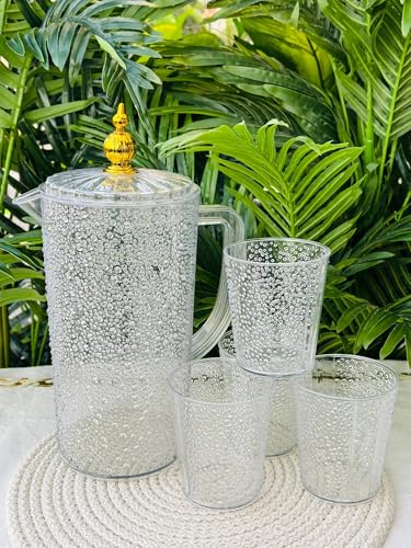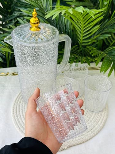 - طقم مشروبات فاخر: يتضمن إبريق أكليرك شفاف بتصميم فقاعات أنيق مع 4 أكواب متناسقة، مثالي لتقديم العصائر والمشروبات الباردة بأسلوب عصري