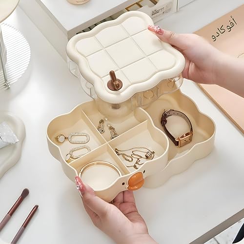- It includes four dedicated storage compartments for separating jewelry and cosmetics, along with a large flat layer capable of storing bulkier items like powders and bracelets, enhancing overall organization.