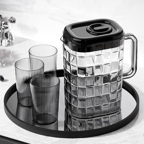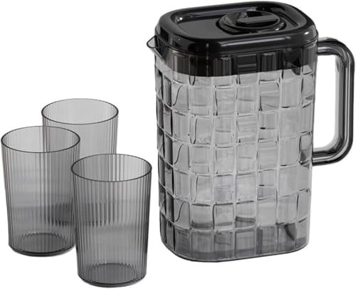 - COMPLETE KIT: includes a stylish large capacity acrylic jug with 3 trendy striped glass cups perfect for juices, drinks, and water
