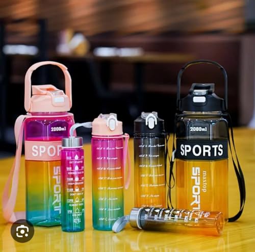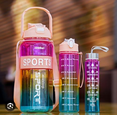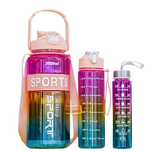 - تصميم متعدد الأحجام للاستخدام المتكامل: يضم الطقم زجاجة جامبو بسعة 2 لتر لتغطية احتياجاتك اليومية من المياه، وزجاجة متوسطة 1 لتر مزودة بيد لسهولة حملها أثناء التنقل، وزجاجة صغيرة بحجم نصف لتر مثالية للأطفال أو للتمرينات القصيرة، مما يوفر لك خيارًا مثاليًا لكل مناسبة.