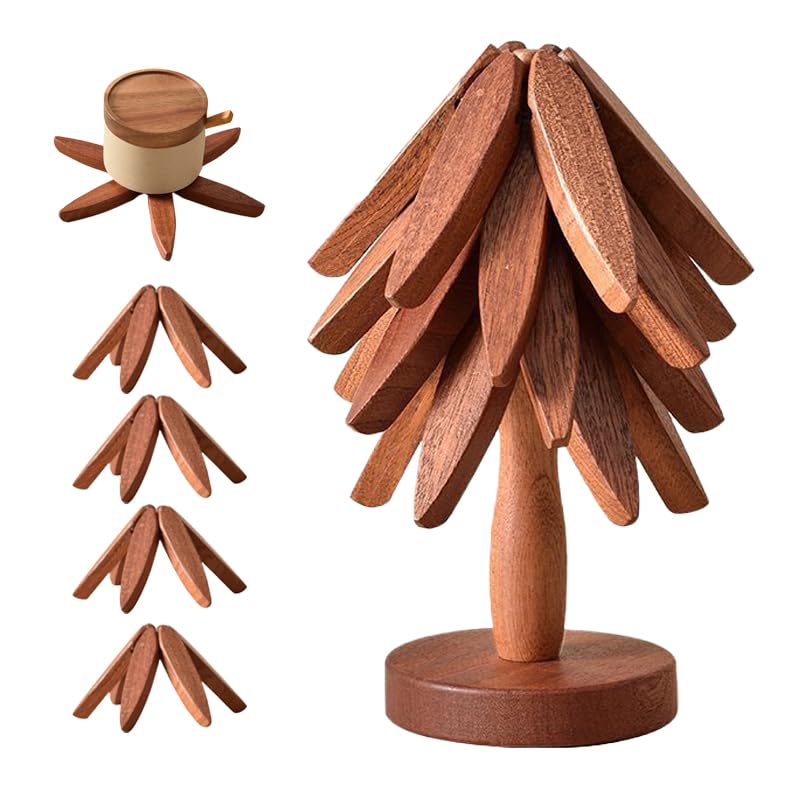 - Innovative Design: This tree-shaped trivet set includes 4 wooden trivets and 1 stand, protecting your countertops and table surfaces from hot dishes. Simply take one from the bracket, and watch it unfold naturally due to gravity—an enjoyable experience every time you use it!