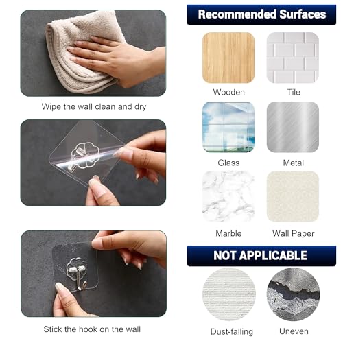 - Heavy-Duty Wall Hooks: Designed to hold up to 22 lbs with proper installation. Simply clean the wall, peel off the protective film, stick the hook, press to release air bubbles, and wait 2 hours for the best results. Not recommended for long-term use with heavy or valuable items.