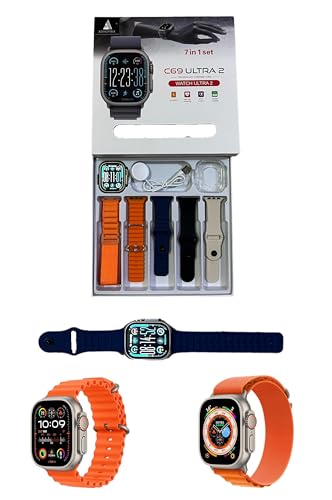 ADHOMAX - ساعة ذكية C69 الترا 2 بشاشة HD مقاس 2.2 انش 7 في 1 لتتبع اللياقة البدنية والمكالمات وتشبع الاكسجين في الدم والرياضة وشحن لاسلكي وموسيقى، متوافقة مع IOS واندرويد للرجال والنساء من ادهوماكس (ذهبي)