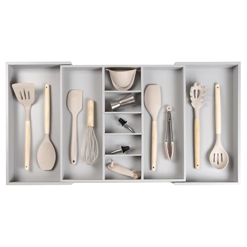 - OPTIMIZE YOUR DRAWER'S STORAGE POTENTIAL - While many drawer dividers stretch to just 22” in width, our organizer can extend up to an impressive 33” wide. This expandability guarantees that you can make the most of your kitchen drawer space.