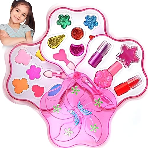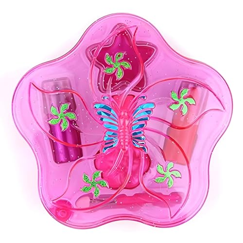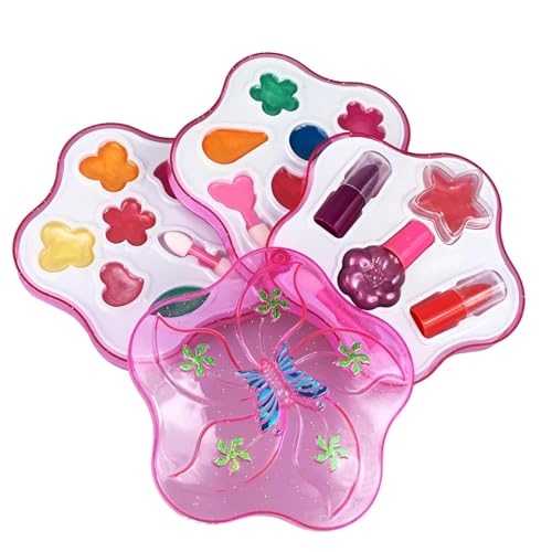 - This children's makeup set features a charming pink box designed with connected sections, decorated with butterflies and flowers, making it visually appealing and fun for kids to play and indulge in pretend makeup activities.