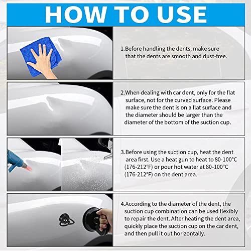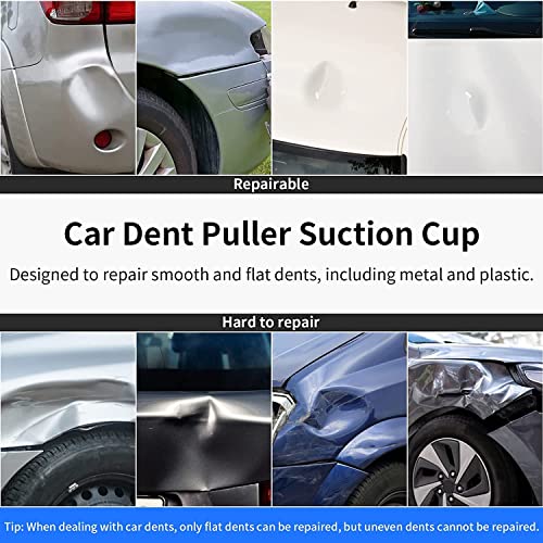 - 【Warm Reminder】Always try to make sure there is good suction before lifting. Different size of the dent puller can help you handle most of the dents of your car. Please make sure that the dent are in the flat surface and should be larger than the bottom suction cup diameter. Car dent repair puller can only work on flat surfaces, not curved surfaces.