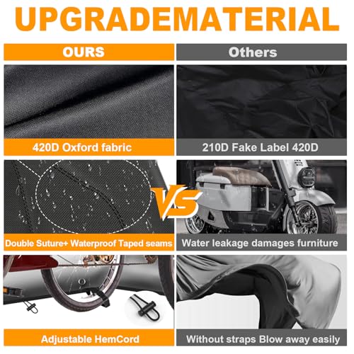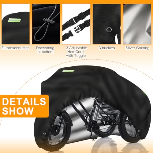 - Complete Protection Against the Elements:The 3 wheeled bicycle bike cover features a 100% full-coverage design, providing complete protection for your electric trike. Equipped with a strong retractable rope and 3Buckle strapat the bottom, it can be easily adjusted to ensure a secure and snug fit. Fluorescent strips improve nighttime visibility.