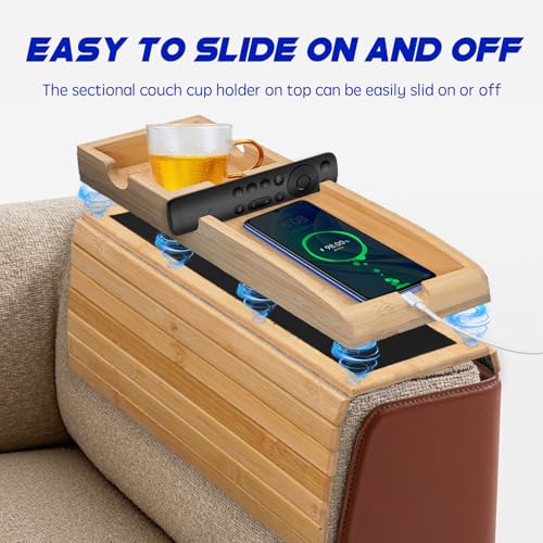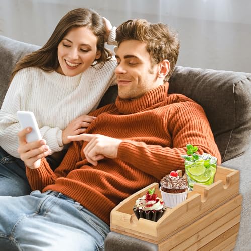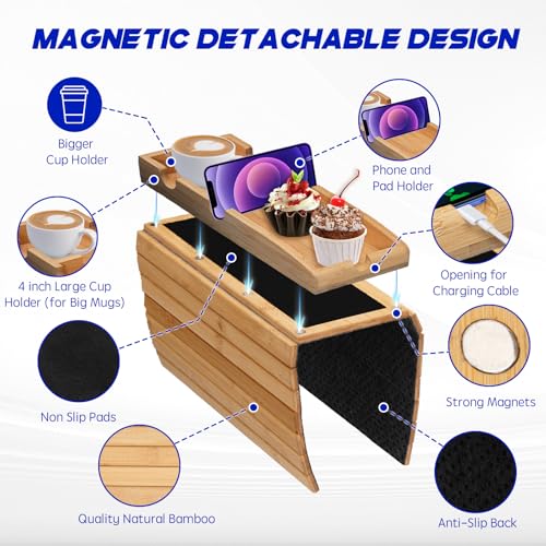 Aelbsty - Couch Arm Table Tray,Sofa Table with 4 Inch Sofas Cup Holder,Bamboo Sofa Tray Table for Couch,Anti-Slip Armrest Organizer, Foldable Magnetic Tray for Snacks, Phone, Control, Coffee Cups