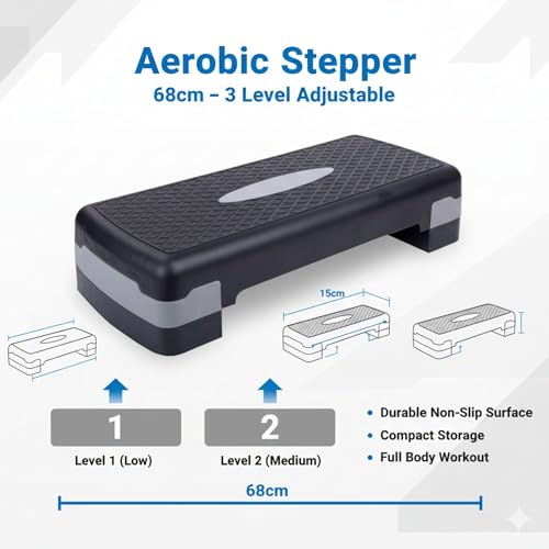 - منصة خطوة صغيرة 68 سم: مثالية للاستخدام المنزلي أو المساحات الصغيرة أو السفر. مثالية للتمارين الرياضية المتدرجة وتدريب وزن الجسم وروتين القلب.