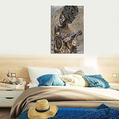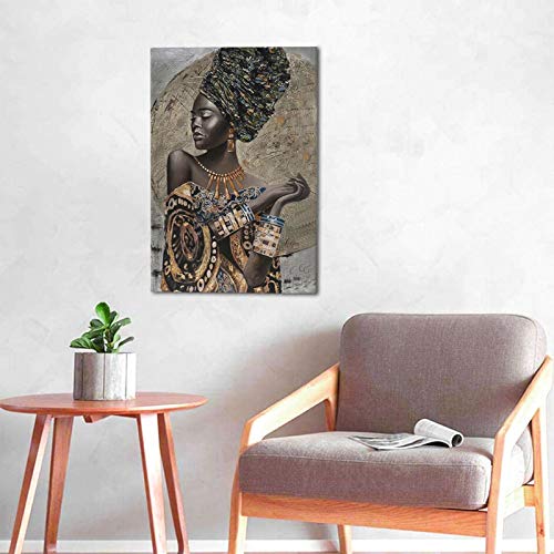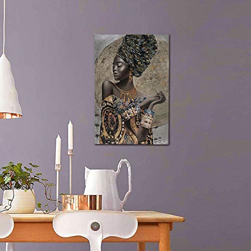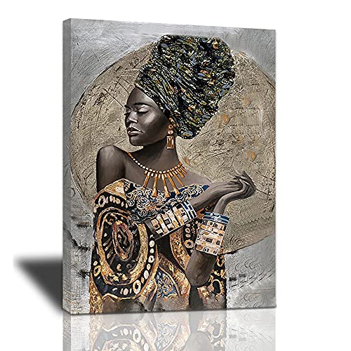 Bulldog Leather Works - African American Wall Art, Canvas Painting Black And Golden Woman Portrait Abstract Gold Earrings Necklace Poster Artwork Modern Home Decorations Framed Ready To Hang For Living Room Bedroom16x24inch