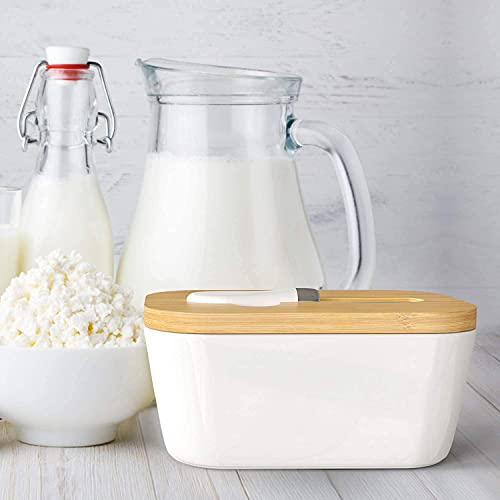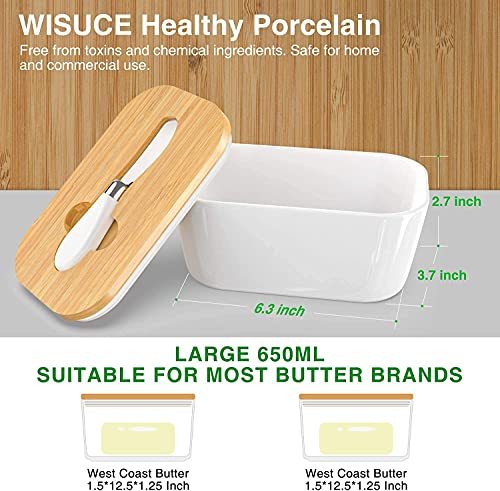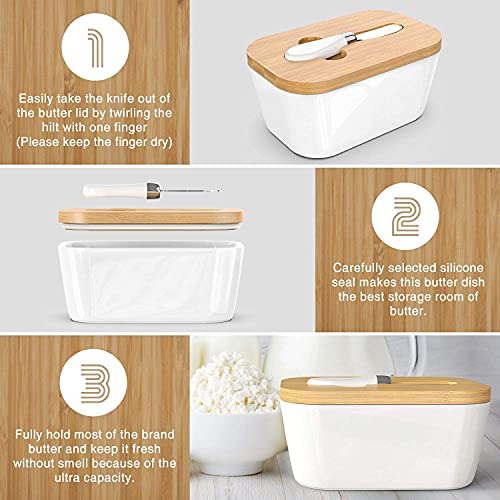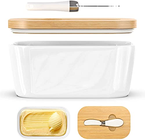 Agabani - علبة حفظ الزبدة من السيراميك من اجاباني، علبة زبدة كبيرة من البورسلين مع غطاء من خشب البامبو وسكين صلب مع غطاء علوي خشبي