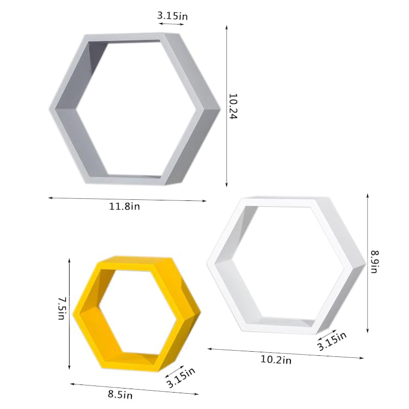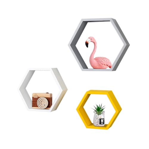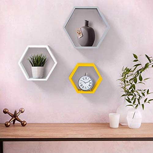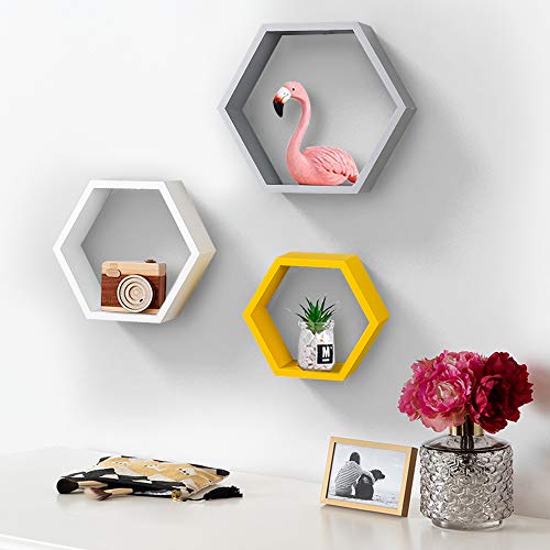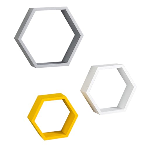 AHDECOR - AHDECOR Wall Mounted Hexagon Floating Shelves, Wooden Wall Organizer Hanging Shelf for Home Decor, Set of 3, White & Grey & Yellow