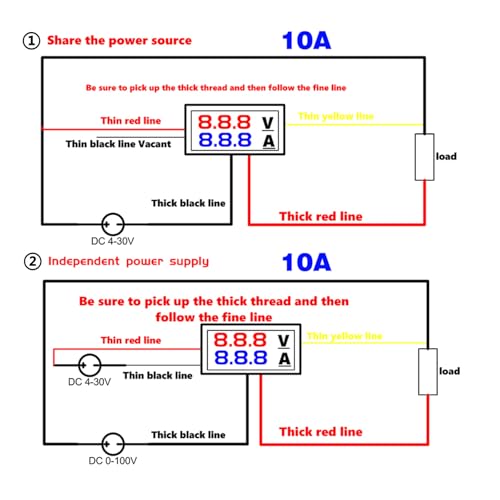 - ✔️ 【2 Colors to Distinguish】 Displays voltage and current at the same time in different colors, red for voltage, blue for current (the current is measured in the negative guide).