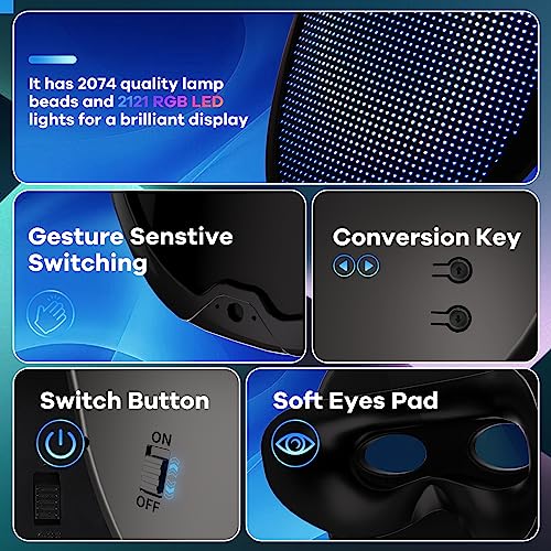 - [Transform Your Look with Dynamic Displays] This is the coolest led mask for this Halloween.The led programmable face mask can be controlled by phone app and has up to 45 animations and 70 still images to choose from, and even you can even transform faces by simply waving your hands. The led mask light up powered by a remarkable 2074 style lamp bulb setup and 2121 RGB light bulbs, this light up mask It’ll make you the center of Halloween party.