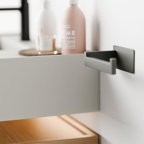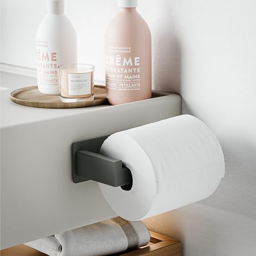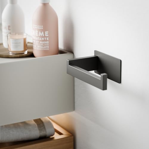 - Wide Compatibility - Premium self-adhesive toilet paper holder with clean lines, ideal for bedroom, bathroom and toilet, suitable for tile, wood, plastic and glass. The L-shaped design of the toilet paper holder ensures that the toilet paper can be easily rotated from the wall. The hooks on the back effectively prevent the paper from slipping.