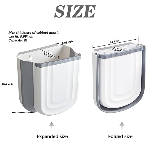 - 【Quality Materials】This kitchen trash can is made of high-quality food-grade PP TPE materials, ensuring safety, odorlessness, and durability. The small hanging trash can is constructed with silicone, making it collapsible and highly space-saving. It measures 10.6*9.5*5.9 inches and has a capacity of 2.4 gallons.