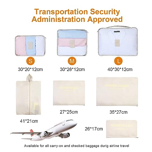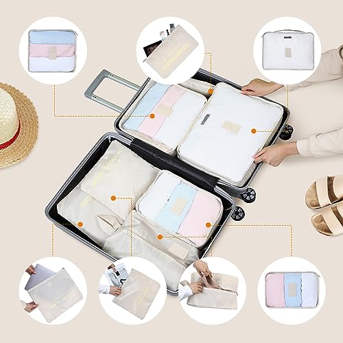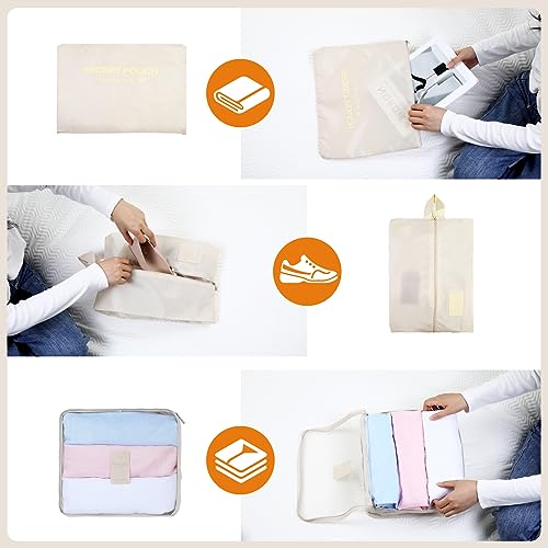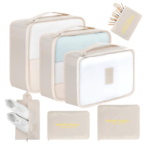 AiQInu - مجموعة منظم شنط السفر من اي كلنو أكياس تعبئة مكعبة مقاومة للماء لشنط لتخزين الملابس والأحذية والملابس الداخلية 7 قطع بيج . البوليستر