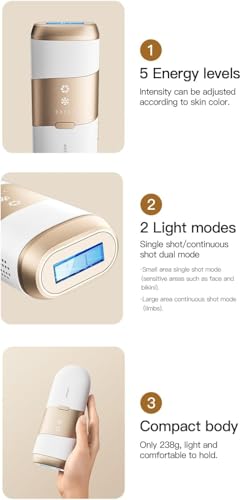 - Customizable Settings: With five adjustable energy levels and two mode settings, you can tailor each session to suit your comfort and intensity preferences: 1.Single Shot Mode for small, sensitive areas. 2.Automated Glide Mode for larger body areas.