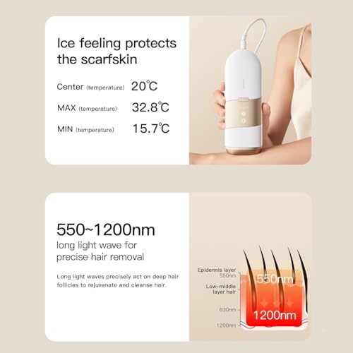 - Painless and Gentle: The ice-cooling technology keeps skin at a safe, comfortable temperature, ensuring a gentle and soothing hair removal experience, ideal even for sensitive areas like the face and bikini line.