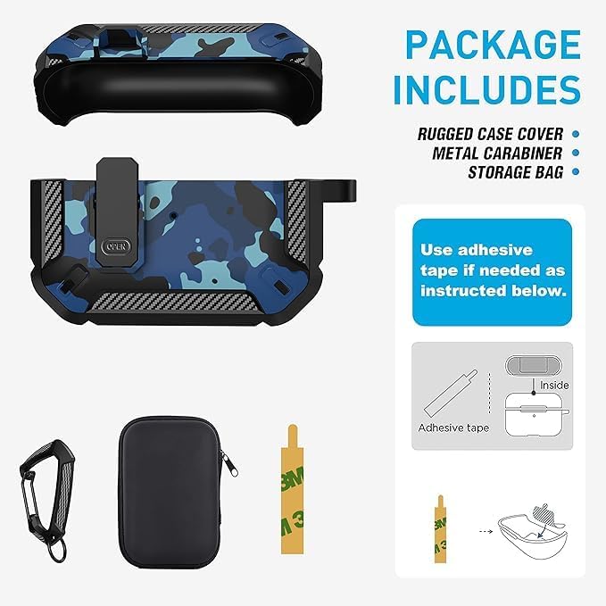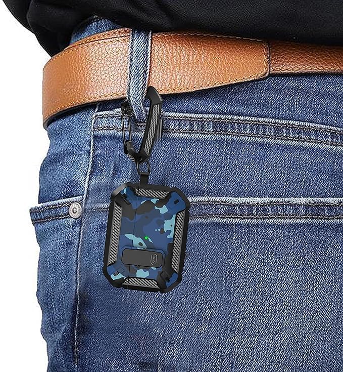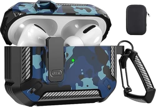 ELMO3EZZ - جراب حماية بتصميم متين مزود بقفل وإضاءة ليد أمامية مرئية وسلسة مفاتيح لسماعات آبل ايربودز برو الجيل الأول موديل 2019 من المعز، لون أزرق مموه، اس اي