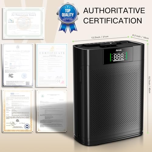 - LARGE COVERAGE: The air purifier is perfect for large, indoor spaces, especially large bedrooms. The air purifier has a powerful filtration system that can remove particles as small as 0.3 microns. It can purify the air of a 1300 ft² space once/hour (based on AIRTOK Original Filters; not applicable to other replacement filters)