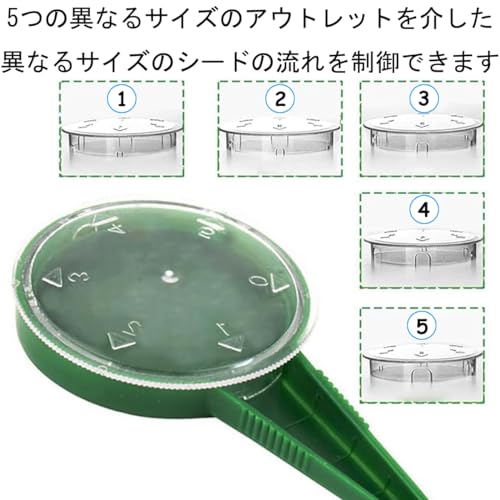 - Seeding Dispenser: 5 different dial setting design allows you to control the flow of different size seeds through 5 different size outlets