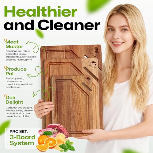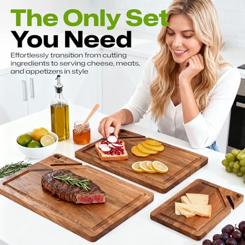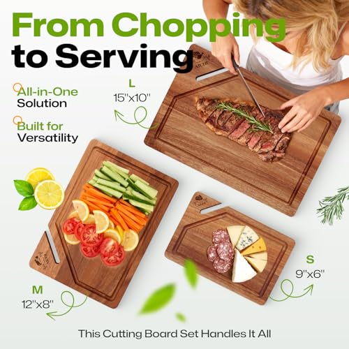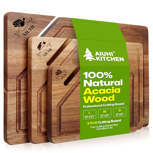 AIUHI - AIUHI Premium Wooden Cutting Boards for Kitchen, 3-Piece Acacia Wooden Chopping Board with Juice Groove, Organic Wood Cutting Board Set for Ideal Charcuterie, Meat & Vegetables