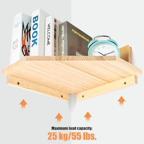- مواد عالية الجودة -- رف زاوية معلق مقاس 28 سم من اكولافي مصنوع من خشب الصنوبر الصلب. مادة الرف العائم مقاومة للماء ومتينة، ولها سعة تحميل عالية وعمر خدمة طويل. يمكن لرف الزاوية الخشبي حمل 25 كجم/55 باوند، وهو ما يكفي للاستخدام اليومي.
