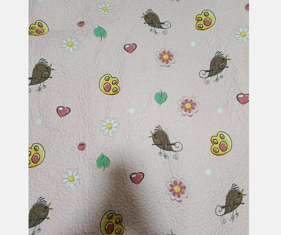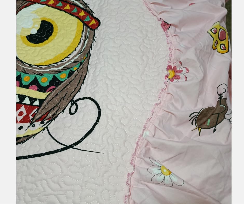 - وجهان مختلفان: لحاف بتصميم ذكي بوجهين يتيح تنويع ديكور الغرفة، وجه بخلفية وردية فاتحة مع رسومات ملونة ووجه آخر بتصميم مكمل