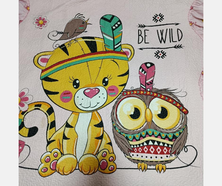 - تصميم مرح وجذاب: يتميز بطبعة ملونة تضم رسومات نمر ظريف وبومة بألوان زاهية مع عبارة "BE WILD" وزخارف قبلية، مثالي لغرف الأطفال