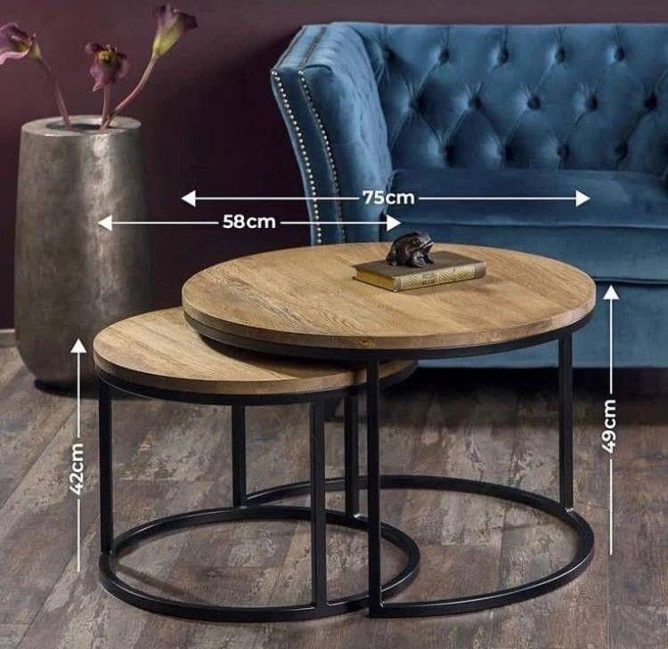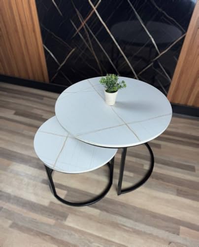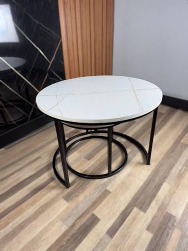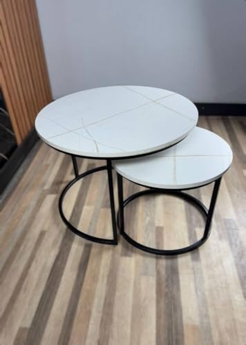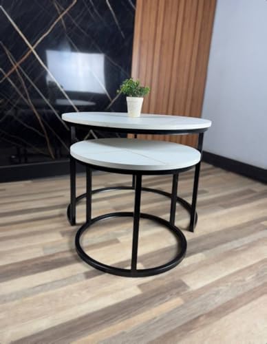 Generic - Al Tamayaz Collection Metal Coffee Table with Wooden Top, 2 Pieces, Diameter 70cm and 50cm, Wooden/Black (White Marble)