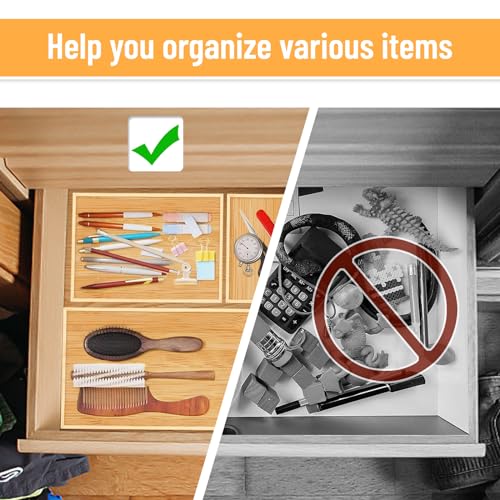 • ️【منظم أدراج من الخيزران】حافظ على منظم الدرج الخاص بك مع مجموعة صواني التقسيم المصنوعة من الخيزران. سطحه الأملس والجذاب مثالي لتنظيم المكياج والمجوهرات وأدوات المطبخ واللوازم المكتبية والمزيد.