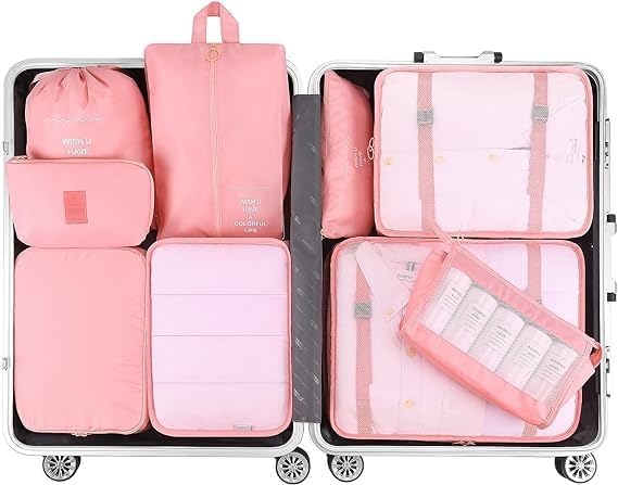 - 7 TRAVEL LUGGAGE ORGANIZERS SET: Includes 3 different sizes of packing cubes organizers( large:10-12 shirts, medium:7-9 Shirts, small: 5-6 shirts), 1 bra underwear bag,1 toiletry bag, 1 laundry bag and 1 zippered bag. Easily packing your luggages neat and tidy in your 21-25 inches suitcase, carry-on bag, drawers and backpack for short or long journey