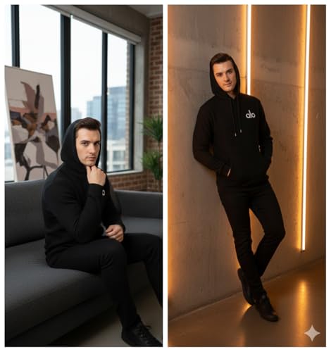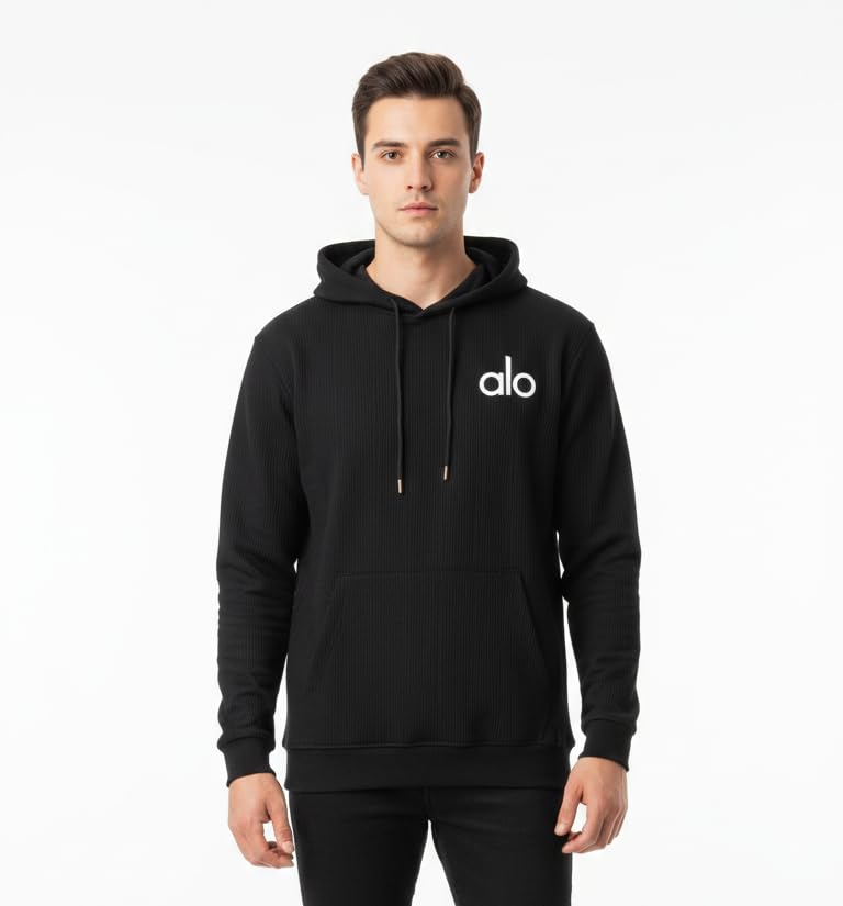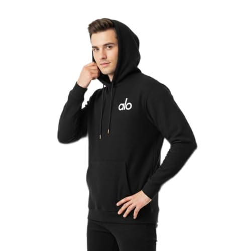 Generic - Alo هودي رجالي بقلنسوة، أسود، بشعار، قماش محبوك، كاجوال