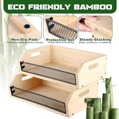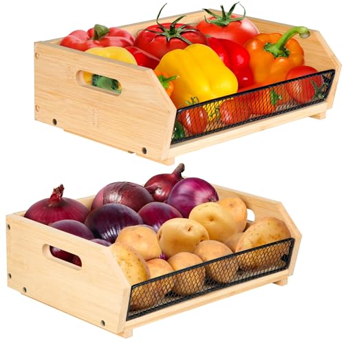 Alyoen - سلة الفاكهة من البامبو من طبقتين ومقبض لسهولة الحمل وبتصميم قابل للتكديس لتخزين البطاطس والبصل لتنظيم الفواكه والخبز والخضروات والثوم والوجبات الخفيفة مناسبة لطاولة المطبخ من اليوين، قطعتان