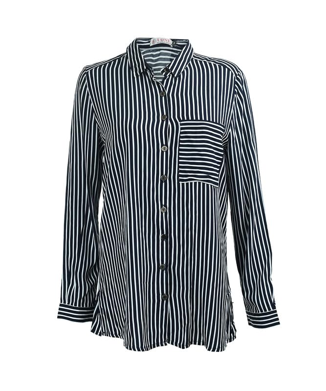 AMANY MAGDY - بلوزة مخططة بازرار امامية واكمام طويلة وجيب على الصدر للنساء من اماني مجدي