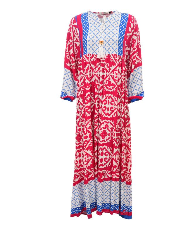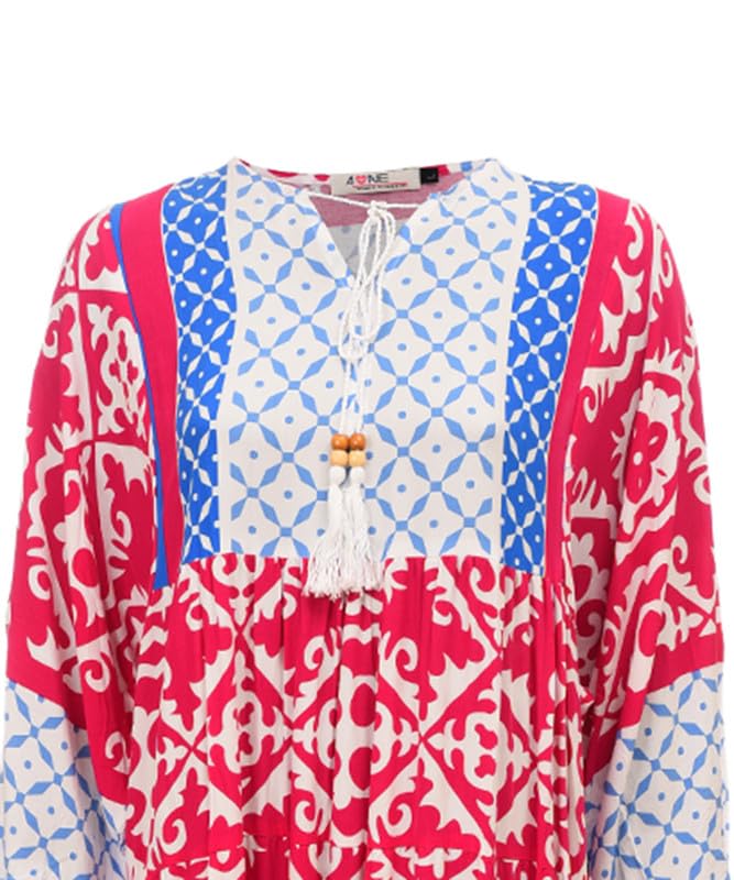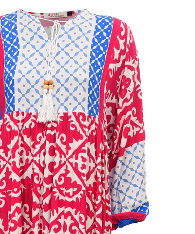 AMANY MAGDY - Amany Magdy Women's cotton patterned mini dress with Longsleeves, a rope tie at the chest, and elasticated cuffs