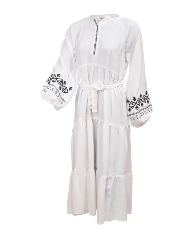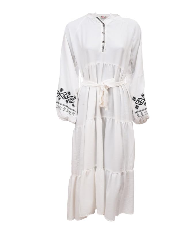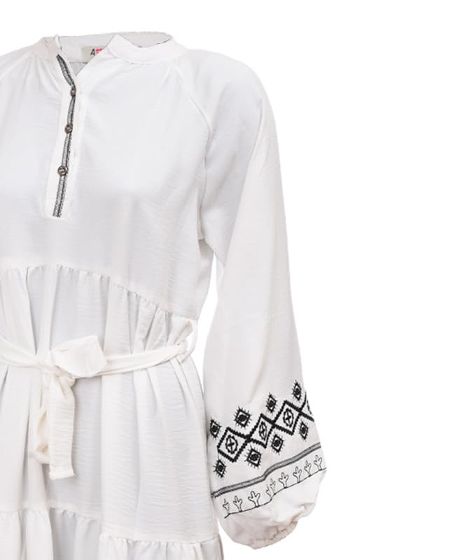 AMANY MAGDY - Amany Magdy Women's linen long-sleeved dress with layers And embroidery on the sleeves and buttons on the chest