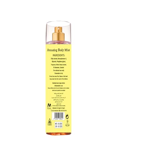 - Pamper your senses with a luxurious body Mist made with carefully selected renowned French fragrances, this sensation of a fresh, sensual fragrance that lasts for hours. Our formula combines stability, juiciness, and smoothness to the skin, perfect for daily use after the shower or whenever you need a touch of freshness and style. Whether you're looking for a light fragrance for work or an eye-catching scent for events, this Splash is your perfect choice. Fine Scent - Clean Feel - Unforgettable Presence