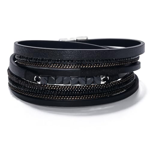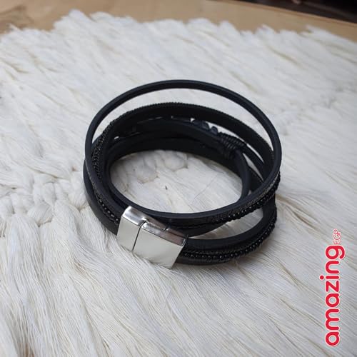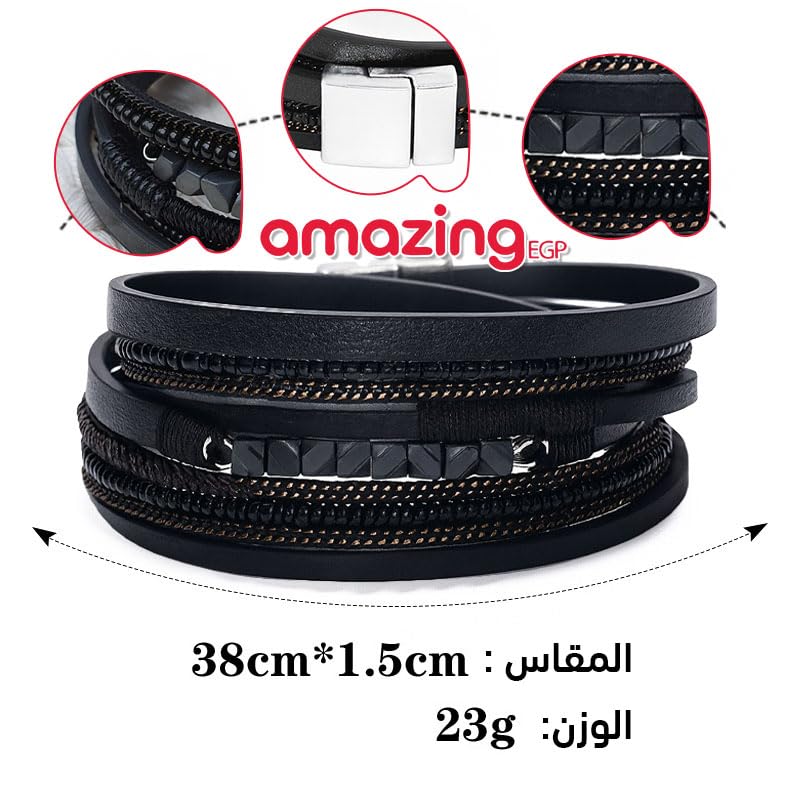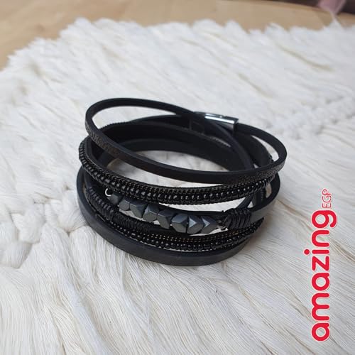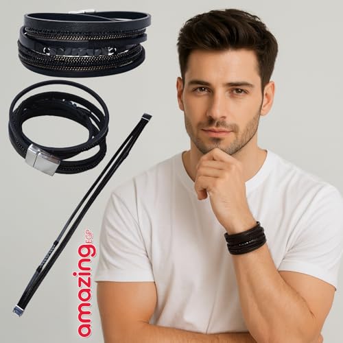 THE PACK - AmazingEGP | Unisex Braided Leather Bracelet, Black, Multi-Layer Design, Magnetic Clasp, Handmade Wristband, Genuine Leather, 23 cm